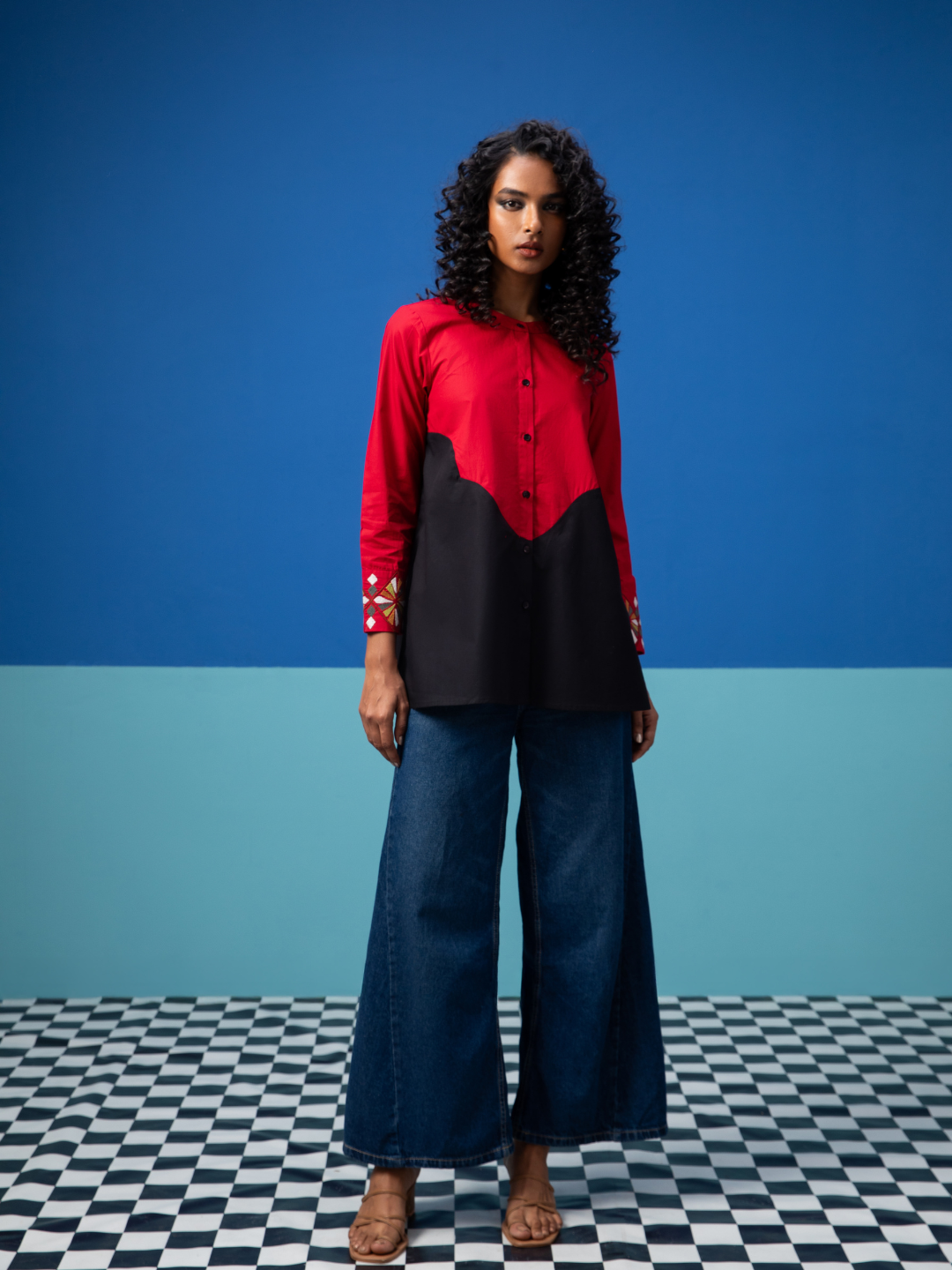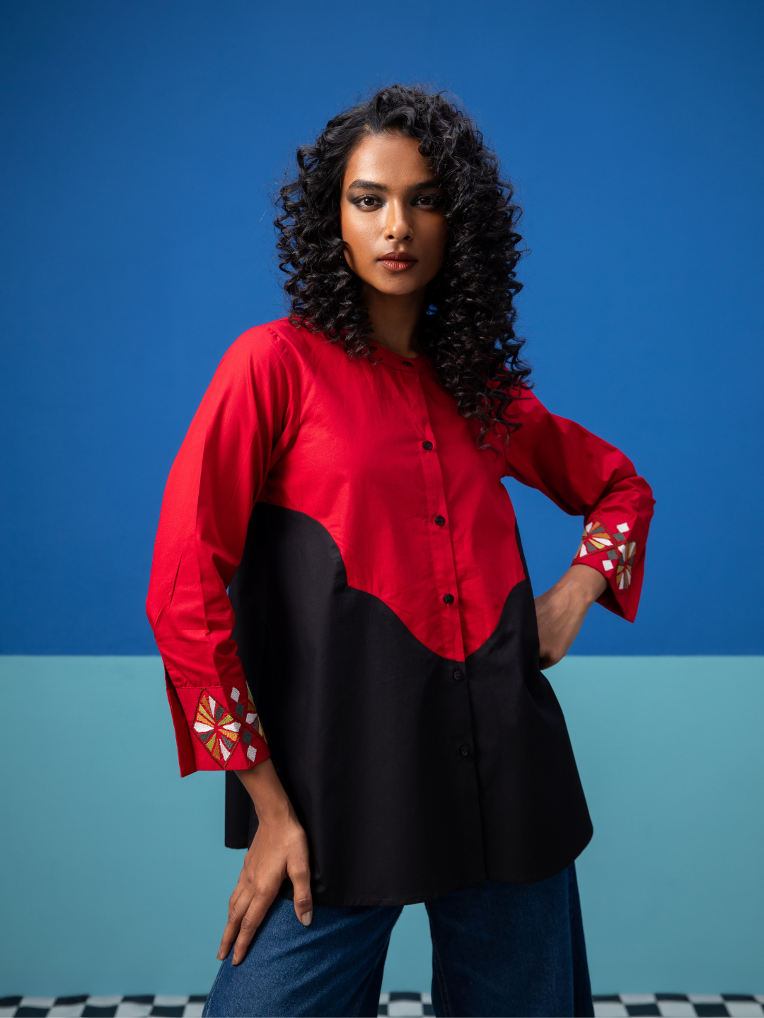 The half and half block colored shirt with a flattering empire joint near the waist is made in pure Poplin Cotton fabric. The embroidered cuff on the sleeves adds this feminine touch to the design. Pair it with your favourite pants and you are good to go
