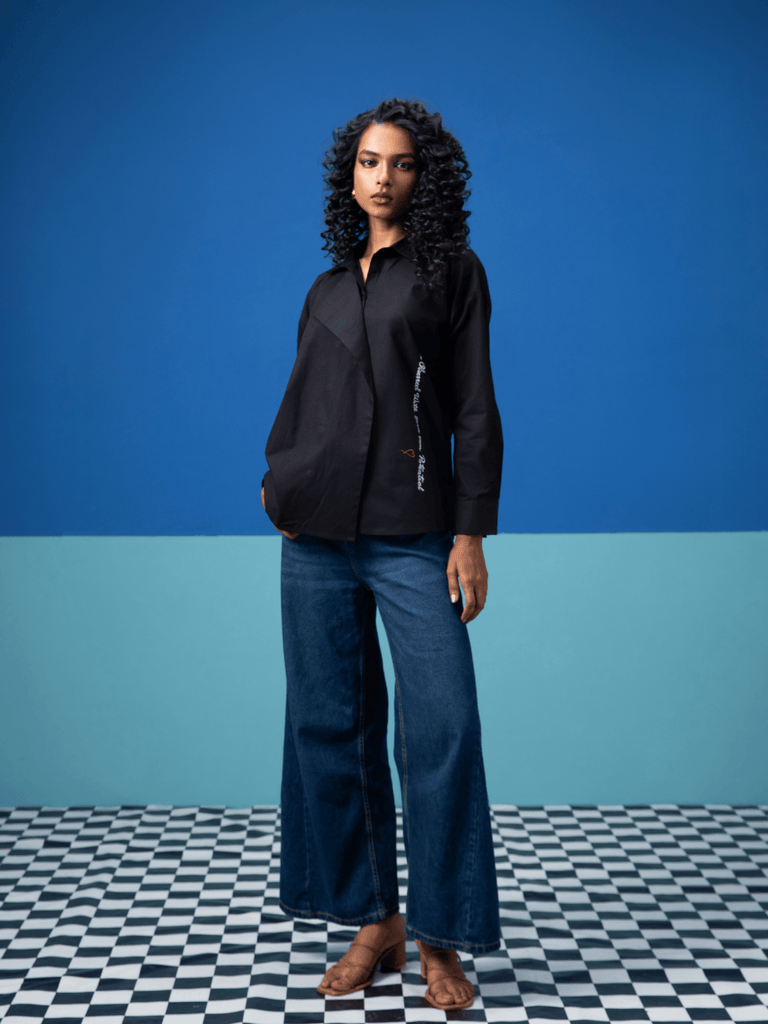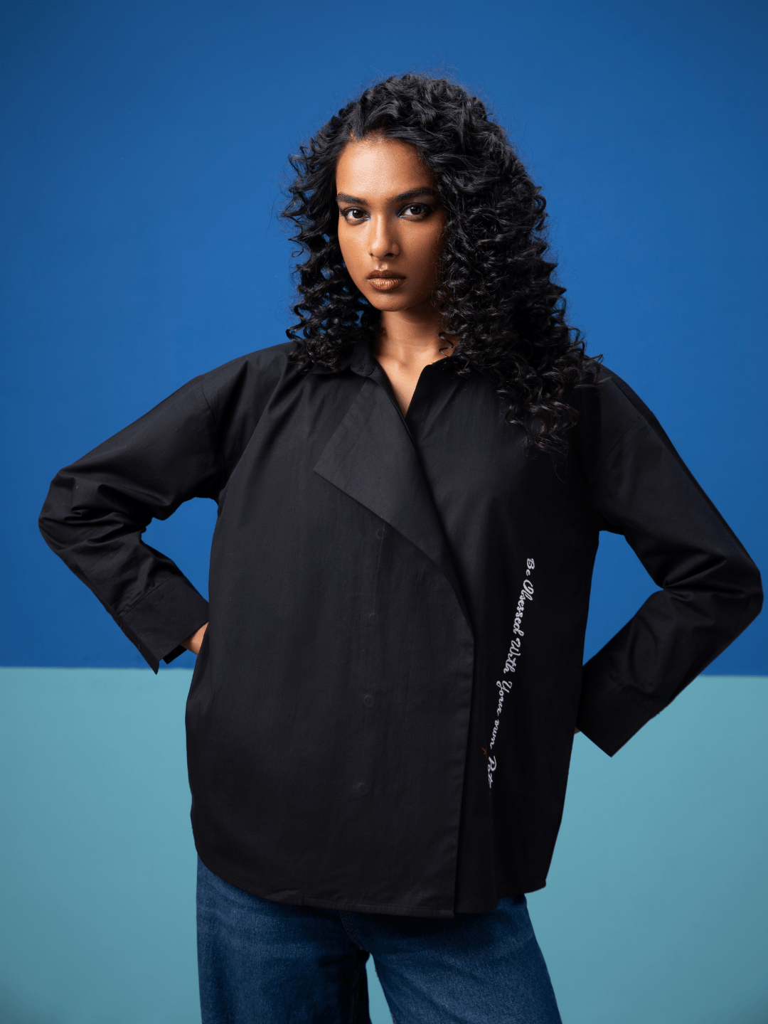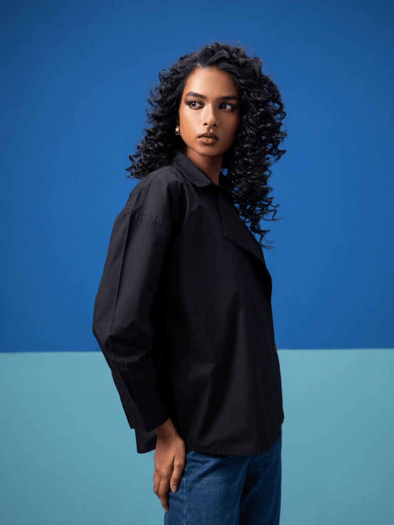 This Poplin Cotton shirt has a lapel collar on one side and a second layer to the design. The lines embroidered on the side of the shirt makes it more artistic and the wearer feel confident. Pair this shirt with a denim pant and you are good to go.