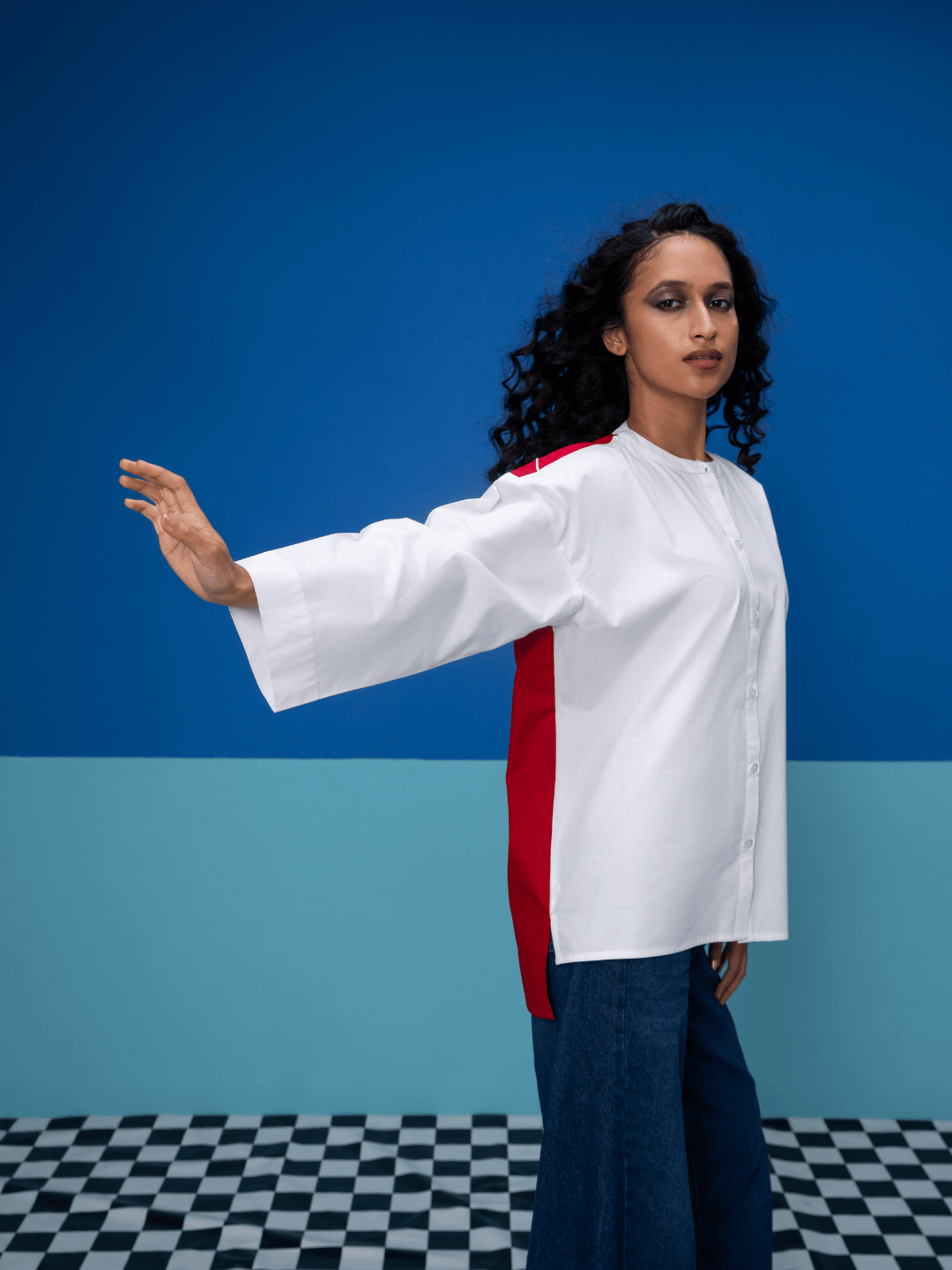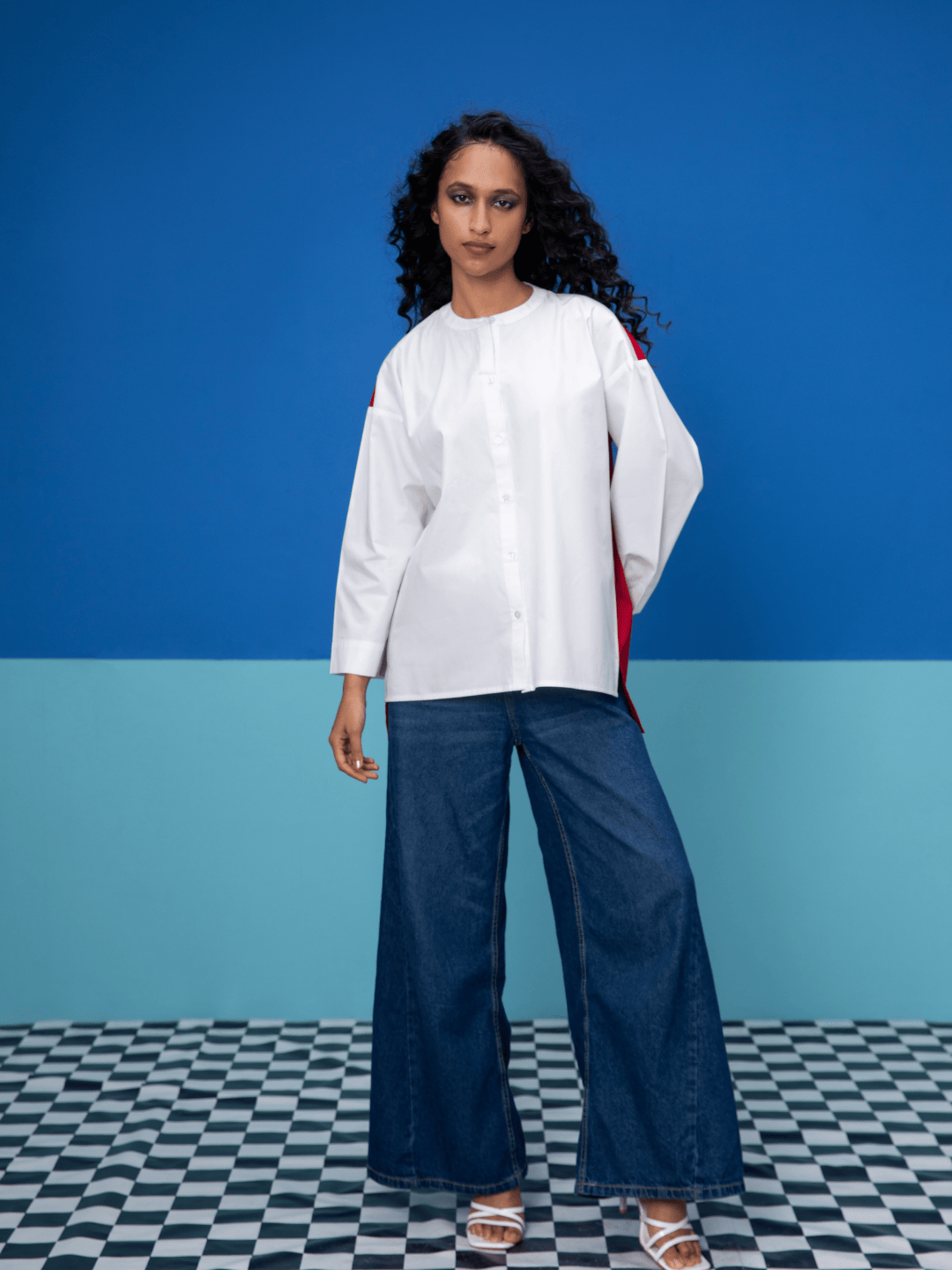 This Poplin Cotton shirt has a white front and red colored back.The oversized fit sets this style apart. Pair it with your favourite pants and style it with some cool accessories.