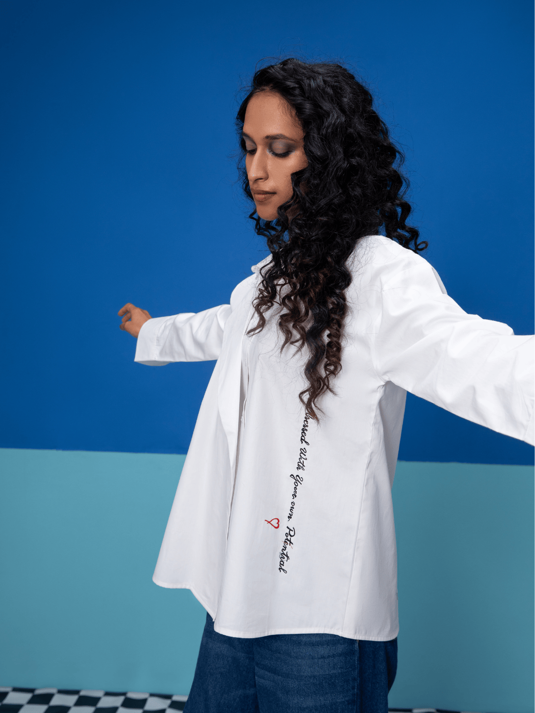 This Poplin Cotton shirt has a lapel collar on one side and a second layer to the design. The lines embroidered on the side of the shirt makes it more artistic and the wearer feel confident. Pair this shirt with a denim pant and you are good to go.